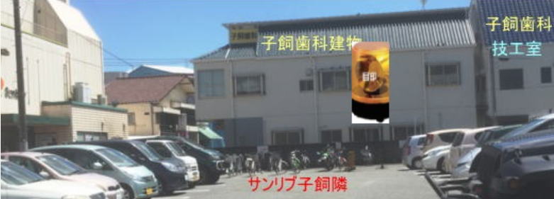 熊本信用金庫から入る 正面に歯科医院の建物が見えています。 当院駐車場はマルショク駐車場の隣接地にあります。